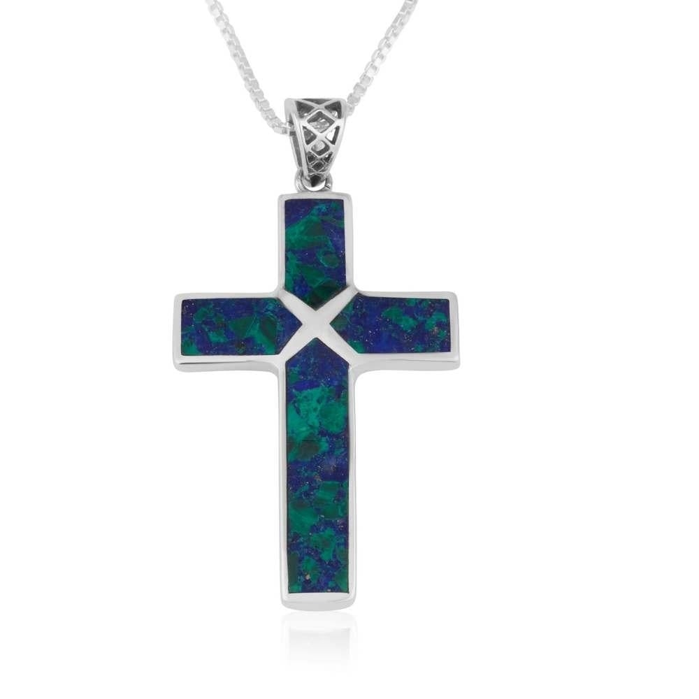 Add a meaningful accent to everyday style with this sterling silver necklace by Marina Jewelry, known for their thoughtful designs that blend quality craftsmanship with modern elegance. The clean Latin cross is inlaid with deep blue Azurite and accented with a central saltire or Saint Andrew's Cross, creating a striking detail that stands out without being flashy.