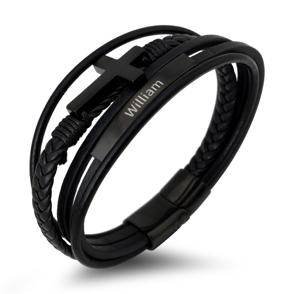 This black leather and stainless steel bracelet blends bold design with personal meaning, making it a standout piece for today’s confident dad. Five textured leather bands stack together for a rugged yet refined look, while the sleek black stainless steel cross offers a quiet nod to faith. A customizable name bar lets you add a personal message or the name of someone close to his heart. Finished with a secure buckle clasp, it’s built to handle everyday life in style.