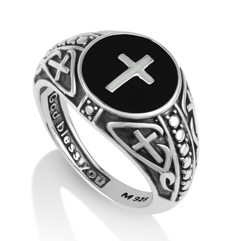 Choose for bold design and meaningful detail. This men’s 925 sterling silver cross signet ring combines contemporary craftsmanship with timeless inspiration, featuring a polished Latin cross set into a sleek black enamel face. Intricate Celtic-style patterns wrap around the band, standing out against an oxidized silver background for a strong yet refined look. It’s a statement piece that reflects strength, heritage, and personal style, ideal for the modern dad who appreciates thoughtful design.