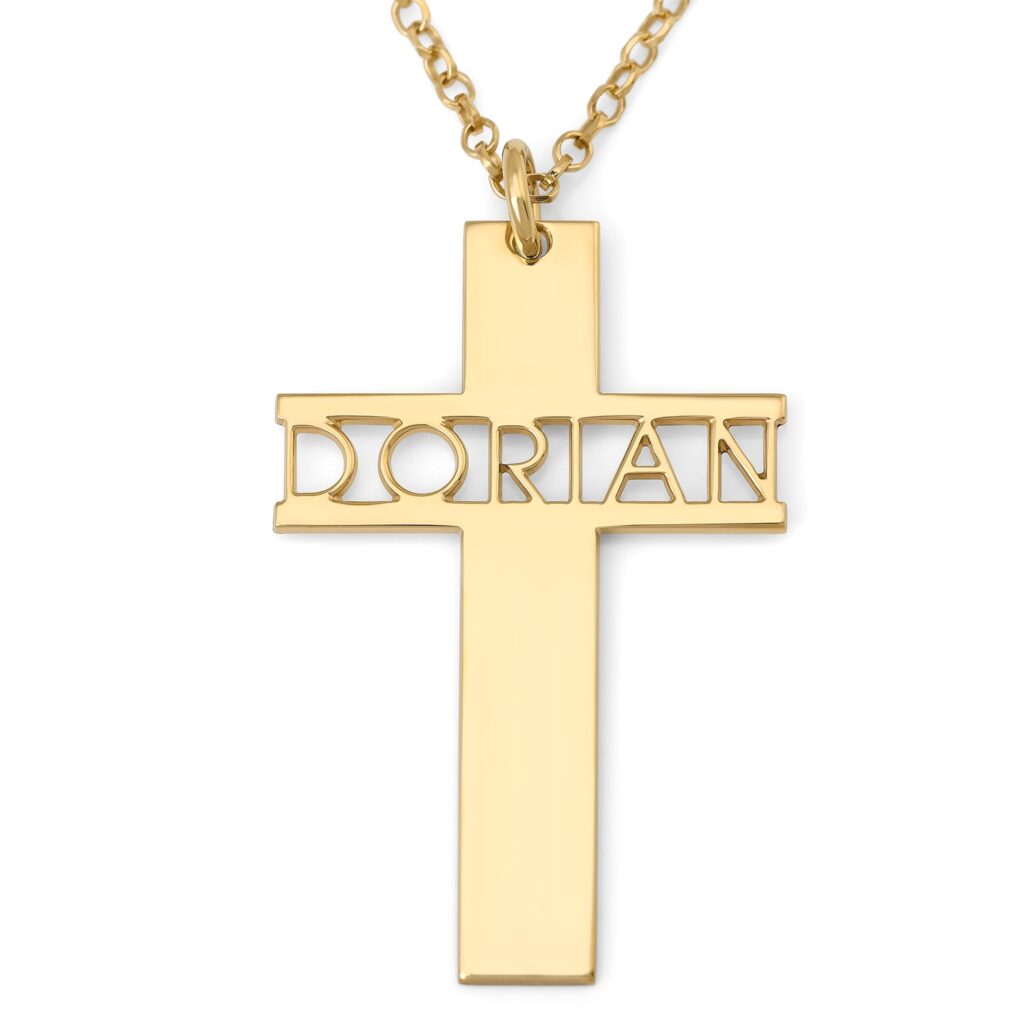 Clean, bold, and effortlessly stylish, this personalized cross necklace is made for the kind of dad who likes to keep it simple but meaningful. Crafted in your choice of polished 925 sterling silver or 24K gold plating, the sleek cut-out design adds a modern edge to a timeless shape. Add his name, your child’s name, or a word that matters, up to eight characters, making this piece uniquely his. Paired with a matching Rolo chain in the length you choose, it’s made to wear every day.
